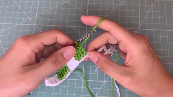 - On the 5th dc, pull only two loops, then switch to green yarn and finish the dc with it (pull green yarn through last two loops).