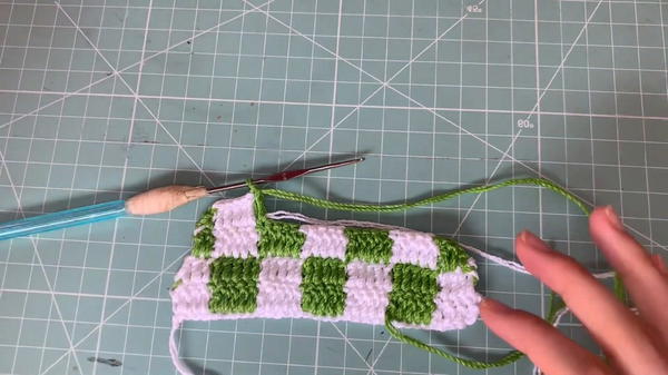 - Repeat rows alternating white and green blocks exactly as in the first row, keeping yarn tensions even.