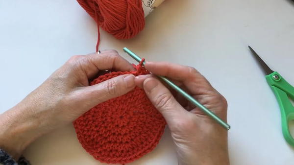 - Work 2 HDC into each stitch around, resulting in 20 stitches.