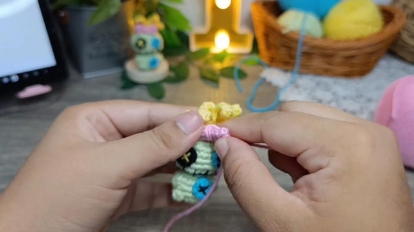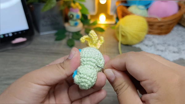 Sew the Button Eyes: The tutor highly recommends sewing the crocheted button eyes onto the face rather than gluing them to give a better finish.