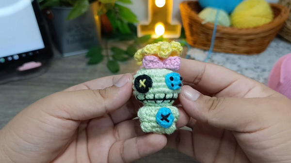 With all the pieces assembled and secured, your miniature "Trapos" amigurumi is complete! The strategic placement of the Bobble stitches, the button-like eyes, and the final embroidered details combine to capture the perfectly imperfect charm of Lilo's beloved doll.