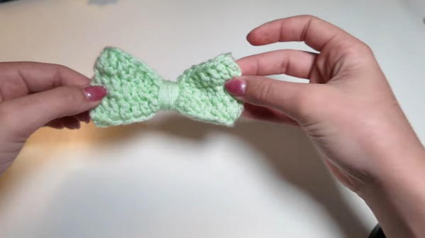 - Using the long tail, wrap it tightly around the center of the completed piece until it forms the bow shape.