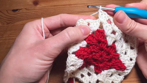 - Chain 2, and repeat with two more clusters of 3 double crochets.