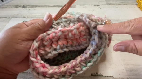 - Thread your tapestry needle and guide the needle around the top edge of the hat in a zig-zag motion to cinch the opening.
