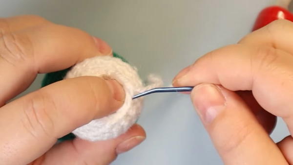 - Use white yarn for the beard. Start with a magic ring, add slip stitches, and chain segments to create the textured beard. Attach it to the face using hot glue or sewing.