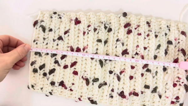 Adjustable Sizing: The tutor provides two different measurement options based on yarn thickness (31x18 cm for thick yarn and 28x15 cm for thinner yarn).
