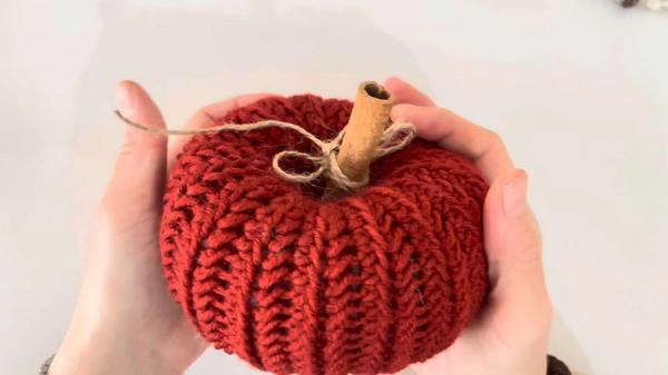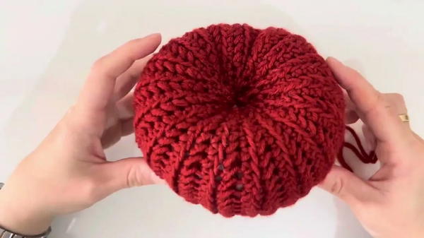Pulling yarn tightly around the body shapes the grooves and gives it that classic pumpkin form. A short stem is added using a few chains and neat stitches to complete the top.