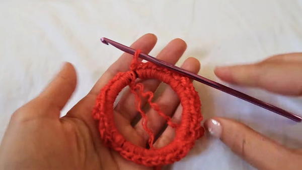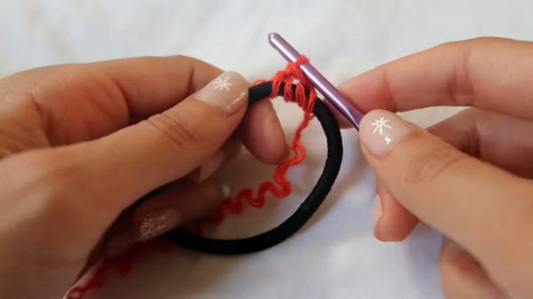 The process starts by crocheting single stitches tightly around an elastic base to create a stable foundation.