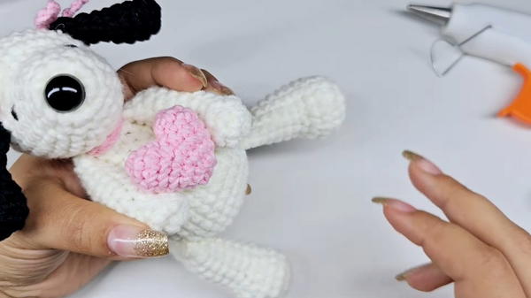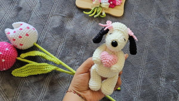 The highlight of this design, a crocheted heart, is made by alternating rows of single crochets and shaping techniques, giving Snoopy a heartwarming detail.