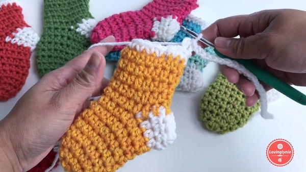 - Continue with a chain of 5 stitches to create a hanging loop for the stocking.