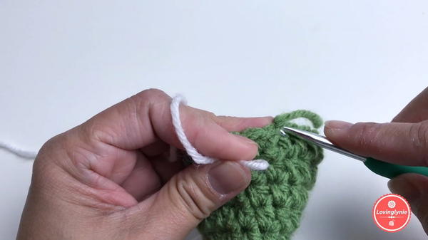 - Alternate the sequence of 1 HDC in two stitches and 2 HDC in the next stitch for a total of 16 stitches.