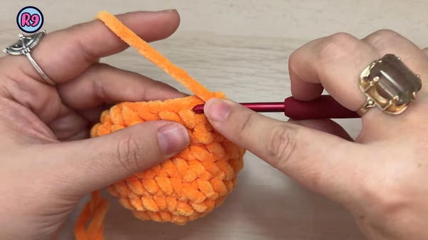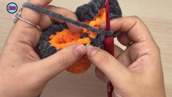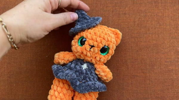 Once the body and head are joined, the iconic witch’s hat is created with strategic back-loop stitches, giving it a classic conical form and a flared brim.