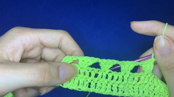 - Chain 1, skip 3 stitches, then make another block of 3 dc in the 4th stitch.