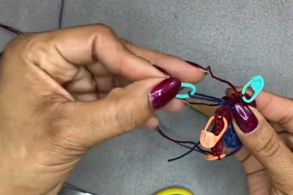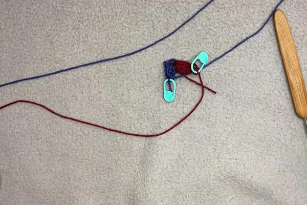 - Yarn: Wine red and blue yarn (goal thread number one).