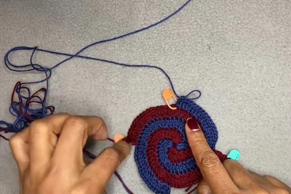 - Take the second color of yarn (e.g., wine red) and attach it to the same loop.