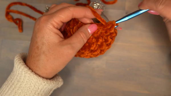 - Work continuous half-double crochet decreases around the entire row until you have 7 stitches left.