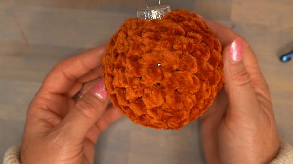 - The pattern uses bulky chenille yarn, providing softness and a luxurious texture that fits perfectly around the ornament.