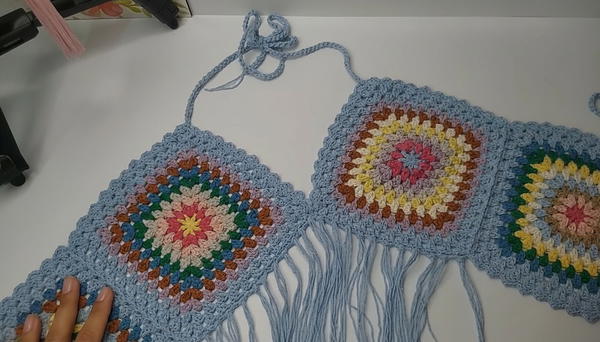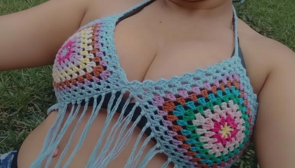 This colorful crochet top is a fun and practical project combining the charm of granny squares with the playful detail of fringes and adjustable ties. Perfect for Carnival, beach days, or casual summer wear, it allows for creativity and sustainable crafting with leftover yarns.