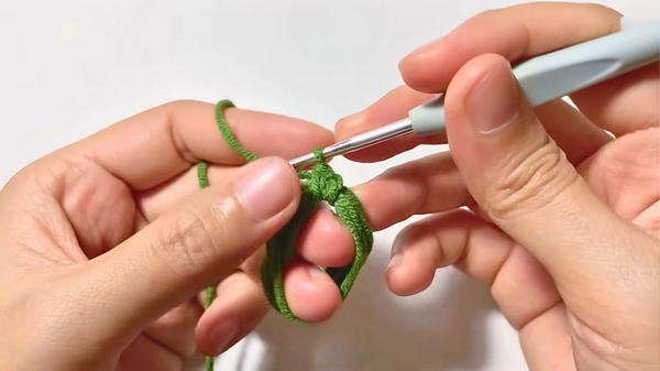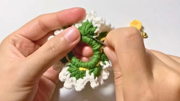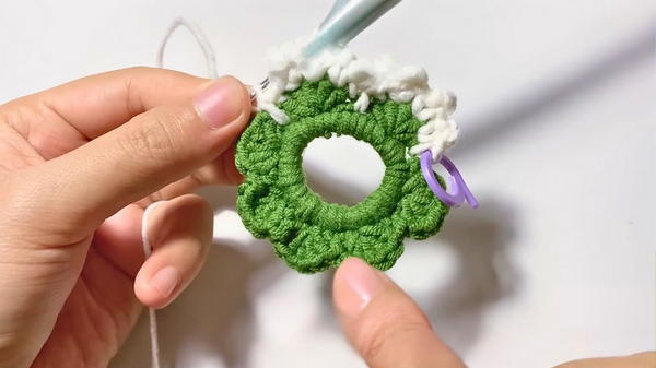 The main feature is the base ring construction, where the initial stitches are worked over multiple wraps of yarn around the fingers, rather than a traditional Magic Ring. This creates a denser, more supportive base. The body of the wreath is made up of seven distinct petals or shell stitches (using 5 Half-Double Crochets) which give the wreath its signature textured, leafy appearance. The bow uses a 3-Double Treble Crochet Cluster for a structured, miniature knot.