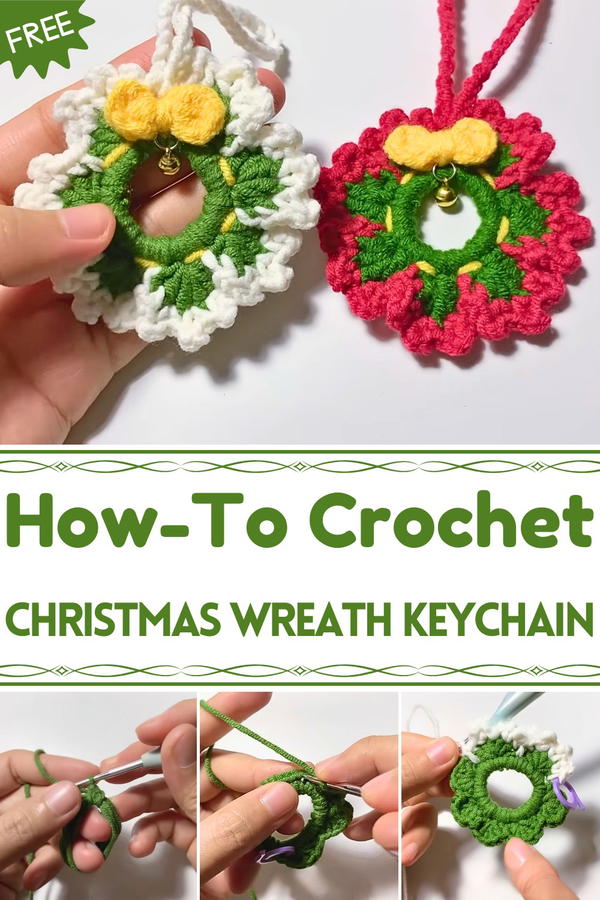 This tutorial guides you through creating a festive and textured Christmas Wreath Keychain. So the project involves crocheting the dense, leafy wreath base in green, adding a contrasting edge, and finishing it with a small yellow bow and a loop for a keychain. At last the unique construction method results in a thick, lifelike miniature wreath.