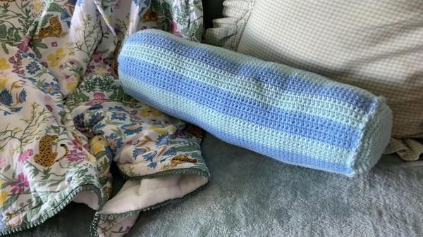 Your cozy, handmade lumbar pillow is complete! The final product features soft, colorful stripes and a curved shape that brings comfort and charm to any space. Whether for your own home or as a gift, this easy crochet tutorial offers both form and function wrapped in a personal touch.
