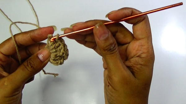 - Begin with magic ring in brown yarn.