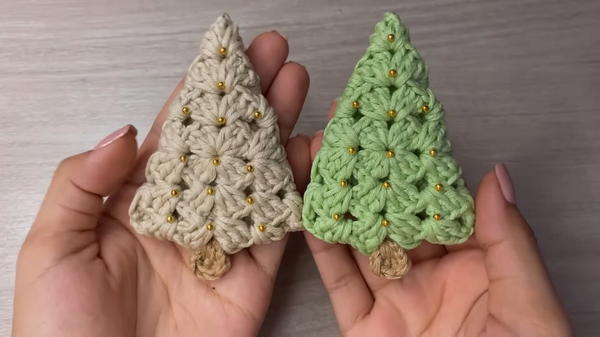 Size: The four-round granny square resulted in a small tree, measuring approximately 8.5 x 8.5 cm when flat. The square can be easily enlarged by adding more rounds.