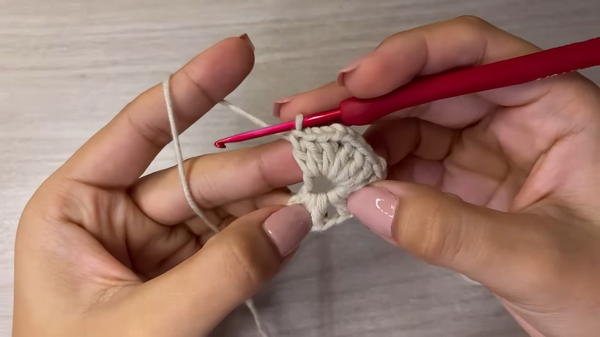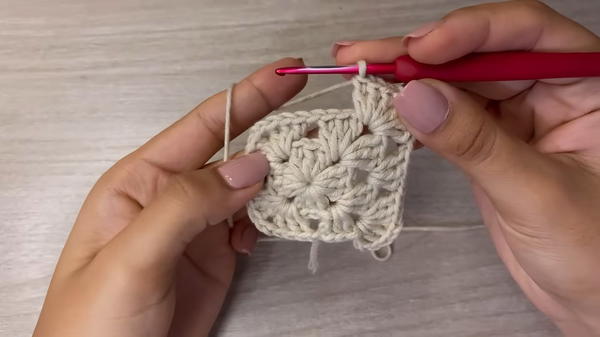 Each square begins with a central loop, worked in clusters of double crochet stitches separated by chain spaces, forming the classic openwork style.