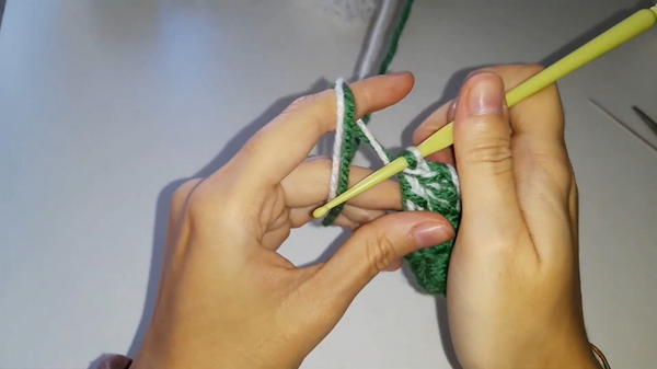 When crocheting with green and white yarn simultaneously for the snowy details, keep the unused yarn taut at the back to avoid tangling and messy transitions between colors.