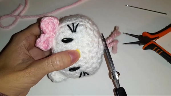 - Pinch the ear into shape and sew it securely to the top of Hello Kitty’s head.