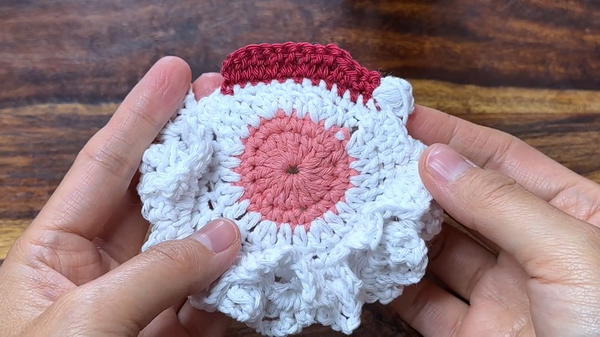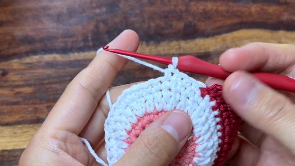 - Create 4 single crochets in white yarn to form the trim of Santa’s hat.
