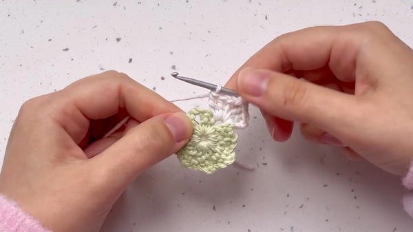- Make 2 double crochets, chain 2, and make 3 double crochets.