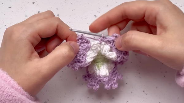 - Repeat the decorative pattern (chain 3, slip stitch at the base, 2 double crochets) once more into the same space.
