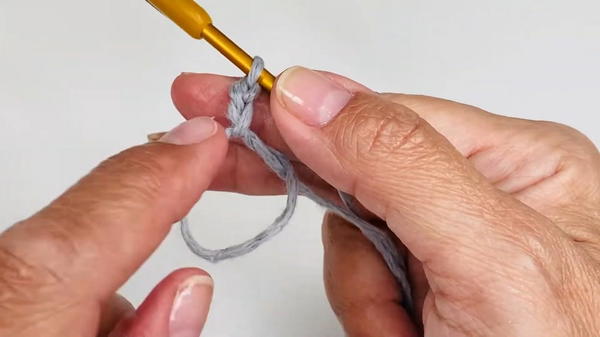 - Insert the hook into the loop, capture the yarn from behind, and pull through to create a hoop.