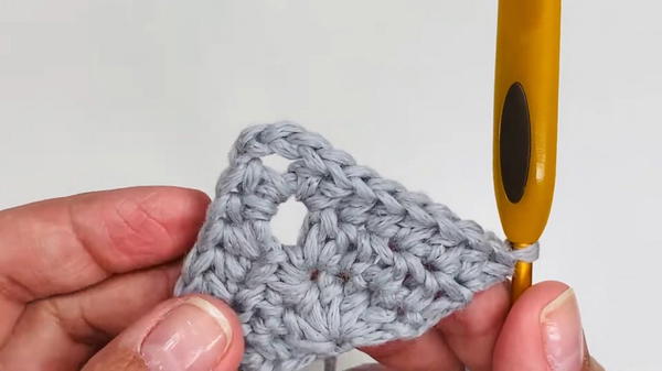 - At the center peak (the chain-3 space), make 2 HDC, chain 3, 2 HDC.
