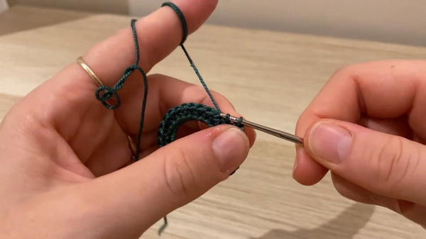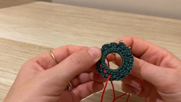 The process begins with covering a small ring base (2 cm diameter) using single crochets in dark green cotton yarn, tightly wrapping the base in 25 neat stitches.