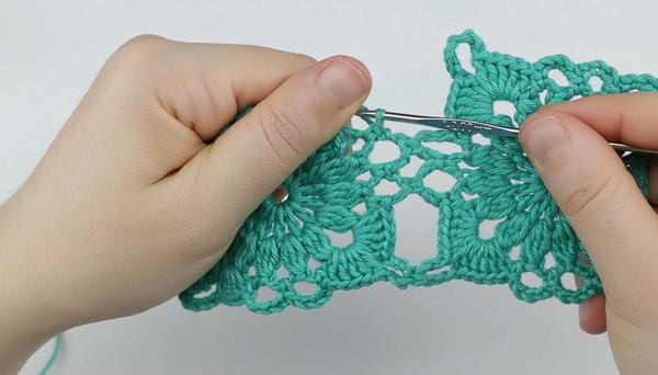 To maintain crisp square corners, make sure your 7-chain loops in the corners stay loose enough—not too tight—allowing fabric to lay flat.