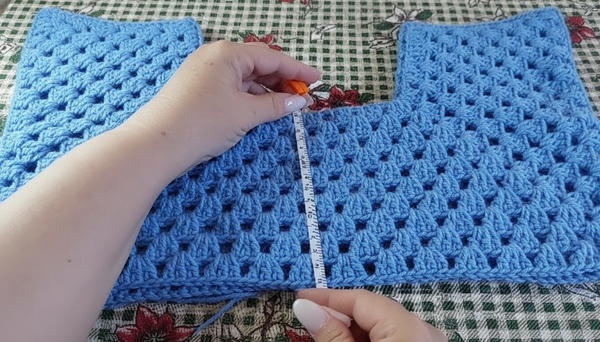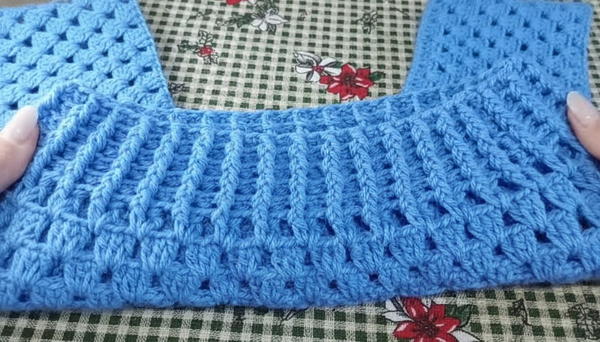 - Work 10 groups of 3 dc on the shoulders (armhole areas).