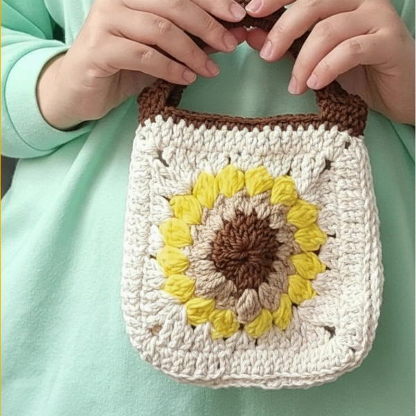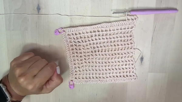 - Work around the square with rows of double crochet (dc) until desired shoulder strap length is reached (example: 14 cm length, 36 cm shoulder-to-shoulder).