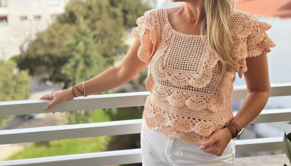This lacy fan-stitch crochet blouse is a beautiful project resulting in a delicate yet structured garment. With customizable length, shaping, and ruffles, it combines elegance and comfort for everyday wear. The detailed fan stitch and finishing techniques develop your crochet skills while creating a standout piece for your wardrobe.