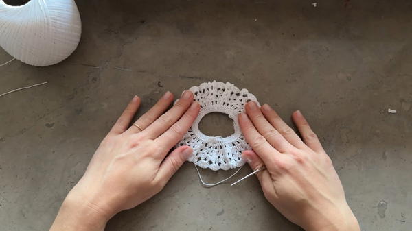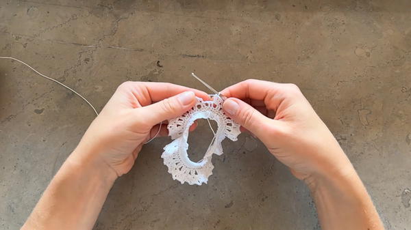 - Work 8 double crochets into each chain-3 space to create the final layer of frills.