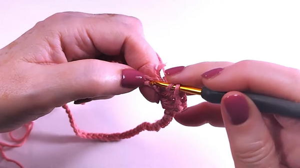 - Work 4 double crochets (DC), chain 2, and another 4 DC.