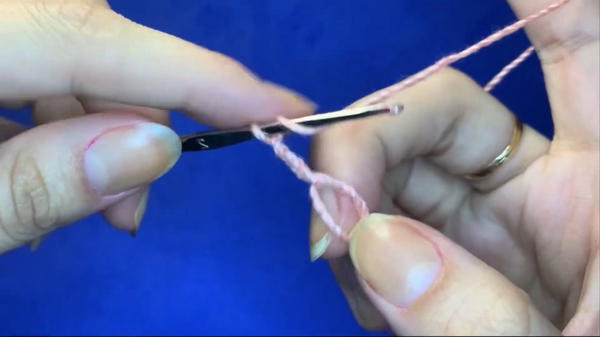 - Make a magic ring by looping yarn over two fingers forming an “X,” insert hook through the front loop, yarn over and pull.