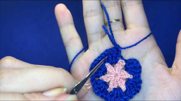- Repeat steps 4-5 all around to form six blocks of 3 double crochets separated by chain 1.