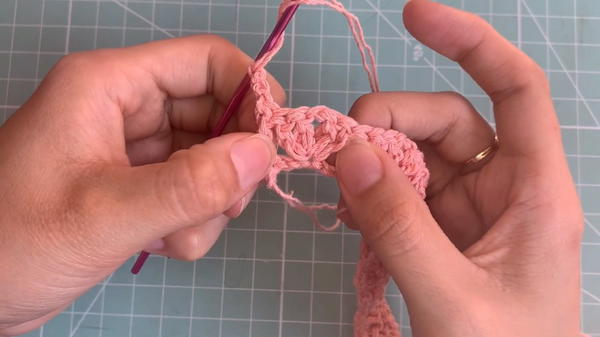 Step 8: Skip 2 chains, work a fan stitch (3 tr – ch 2 – 3 tr) into the next chain.