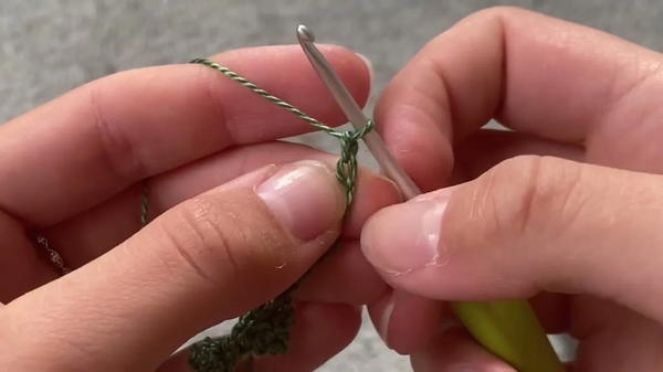 - Insert your hook under the first loop, grab the working yarn, and pull through to make a loop.
