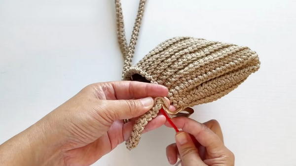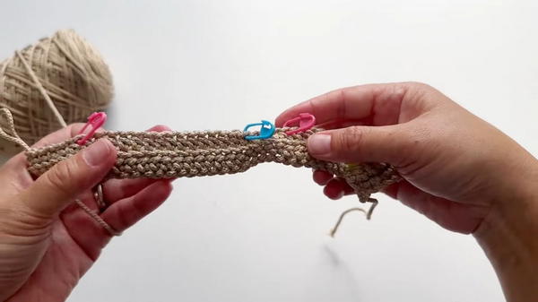 - After completing 21 rows, remove stitch markers and fold the project into a bag shape.