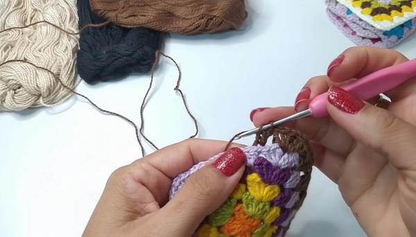 - Use a joining row in brown yarn (or your chosen color) to unify squares.