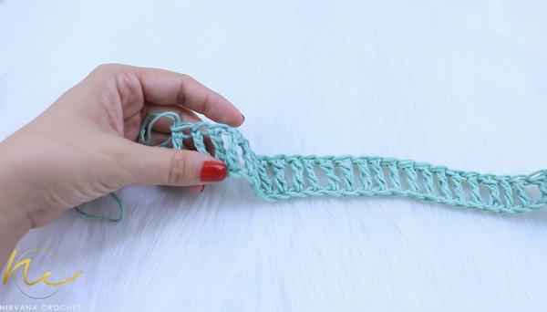 Result: A loose and open stitch fabric approximately 56 cm wide (or your measurement) with the hook size used.