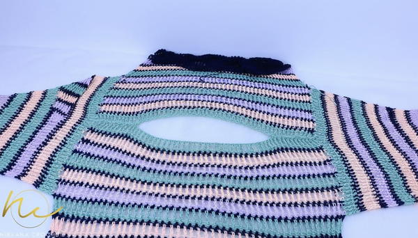 - Leave approximately 12 stitch space at the top center for the neckline (around 13 cm for XL; varies by size).